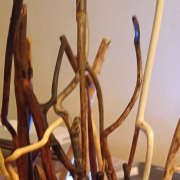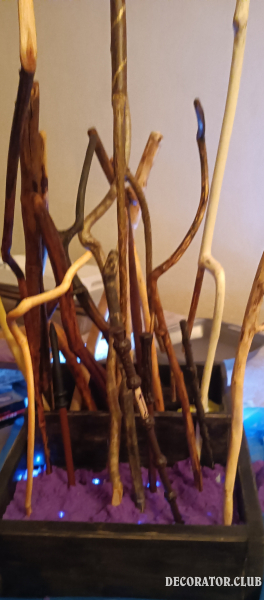 Мдф, травертин тонированный замшей, трафареты с росписью металликами и шелками, веточки золотого шёлка.